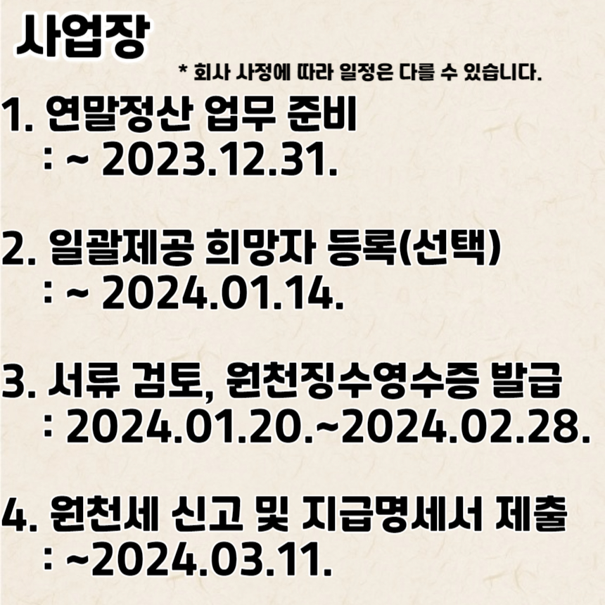 매년 하는 연말정산은 근로자와 사업장의 입장에서 일정을 나눠볼 수 있습니다.